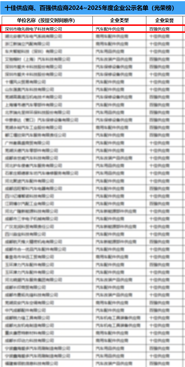 同時,穩(wěn)先微登上“百強供應(yīng)商”企業(yè)光榮榜公示名單,以對其在汽車領(lǐng)域中的突出貢獻(xiàn)進(jìn)行榮譽嘉獎。