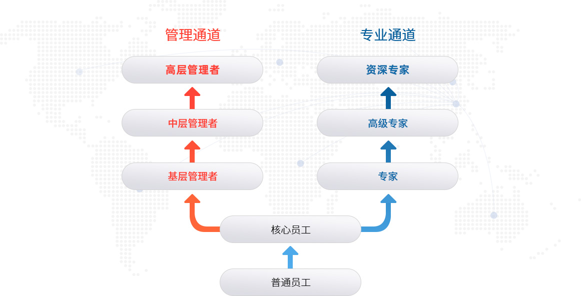 穩(wěn)先為員工提供管理和專業(yè)兩條成長發(fā)展道路,員工可以根據(jù)個人的職業(yè)興趣與專長選擇適合自己的發(fā)展路徑。通過與崗位需求相結(jié)合,使有管理能力和管理潛質(zhì)的員工順利成長為管理者,同時也使?jié)撔你@研技術(shù)、有專業(yè)特長的員工通過自己的努力順利成長為專業(yè)領(lǐng)域內(nèi)的專家。同時公司的大部分中層和基層職位空缺都采用內(nèi)部提升政策,使一些貢獻大、表現(xiàn)的員工獲得更大的施展才能的舞臺,努力創(chuàng)造雙贏。